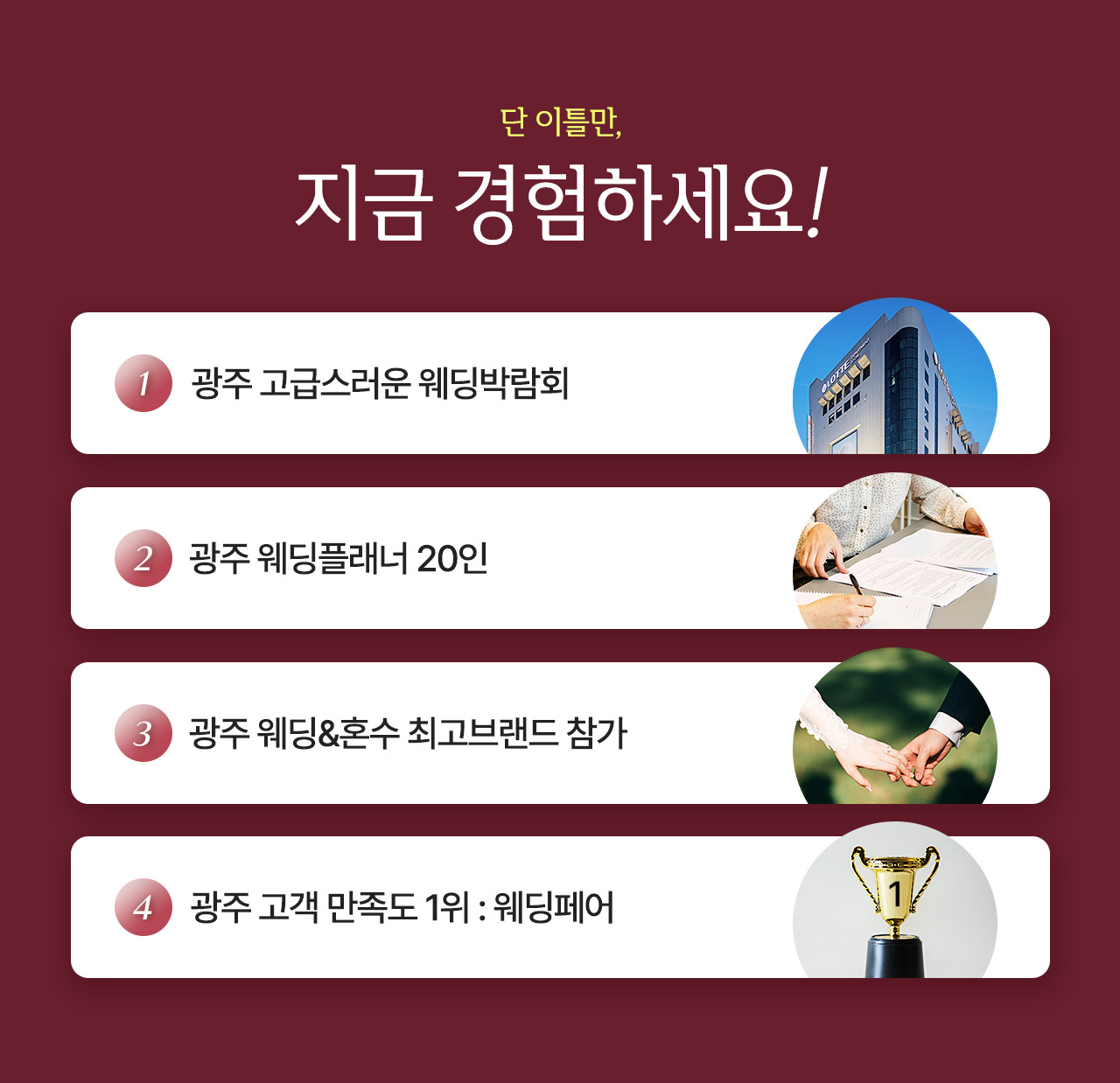 본 프로모션 페이지는 "광주웨딩연합회"의 프로모션 대행사인 '(주)다올연구소'의 'CPAAD'서비스를 통해서 시행되고 있습니다. 관계법령에 의거 본 프로모션에 참여하신 고객님의 개인정보는 상